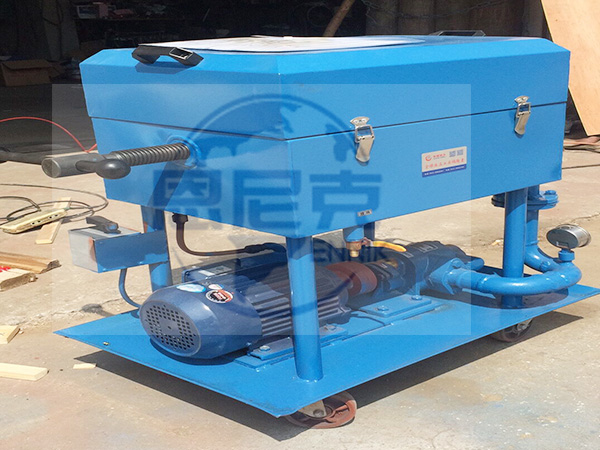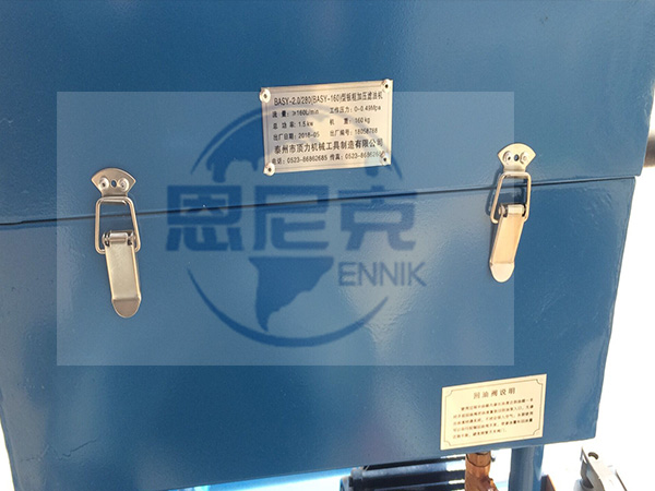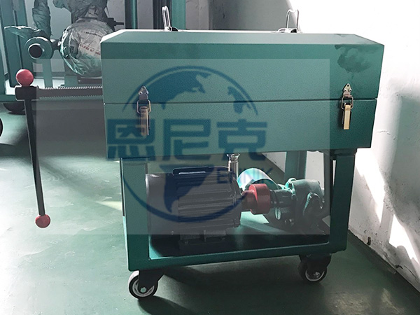 此機是由齒輪輪泵,濾清器,an全閥,回油閥,濾床,后支架,底盤,拉桿,連軸器,以及電動機等部件組成。齒輪泵,連軸器以及電動機安裝在底盤上,濾請器安裝在齒輪泵的前側。在濾清器上裝有回油閥,濾床安裝在齒輪泵的上方,其中濾板框順序交替組成過濾室。濾紙夾在濾板和濾框的中間。進出油口膠管連接在進出管接頭上,當油液從濾清器進油口處被吸入,通過濾清器排除掉較大的顆粒雜志后,在進入齒輪泵。齒輪泵在電機的帶動下旋轉產生擠壓力,使油液進入濾床,滲透出濾紙將油液雜志濾凈。然后將油液從出油管排除出。當油壓超過規(guī)定值時。an全閥就立刻啟動,使油液在油泵中自行循環(huán),油壓不再上升,以確保設備的an全,油樣閥供取油樣進行耐壓及其他理化性能的實驗。本機采用底盤滾輪結構??梢酝ㄟ^人力拉動拉桿移動。